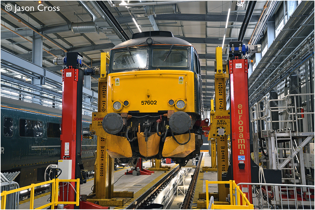 57602 on jacks inside Penzance Long Rock depot. Photo taken during an open day. Date: 13 April 2019 Manipulation Notes: None