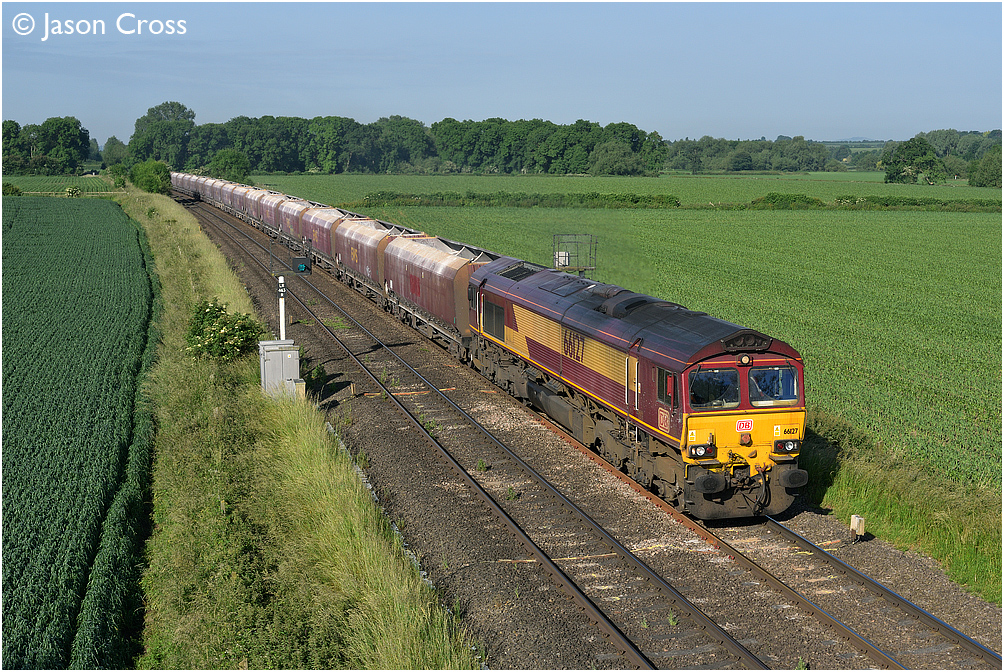 66127 passes Rearsby with the 6L75 Peak Forest to Ely stone hoppers. Date: 14 June 2017 Manipulation Notes: None Camera mounted on a tall pole and remotely fired