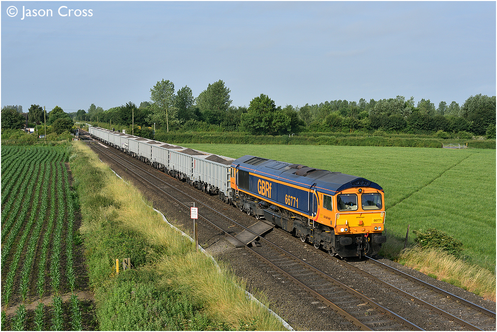 66771 passes East Goscote with the 6L60 Tinsley to Purfleet stone. Date: 21 June 2017 Manipulation Notes: None Camera mounted on a tall pole and remotely fired