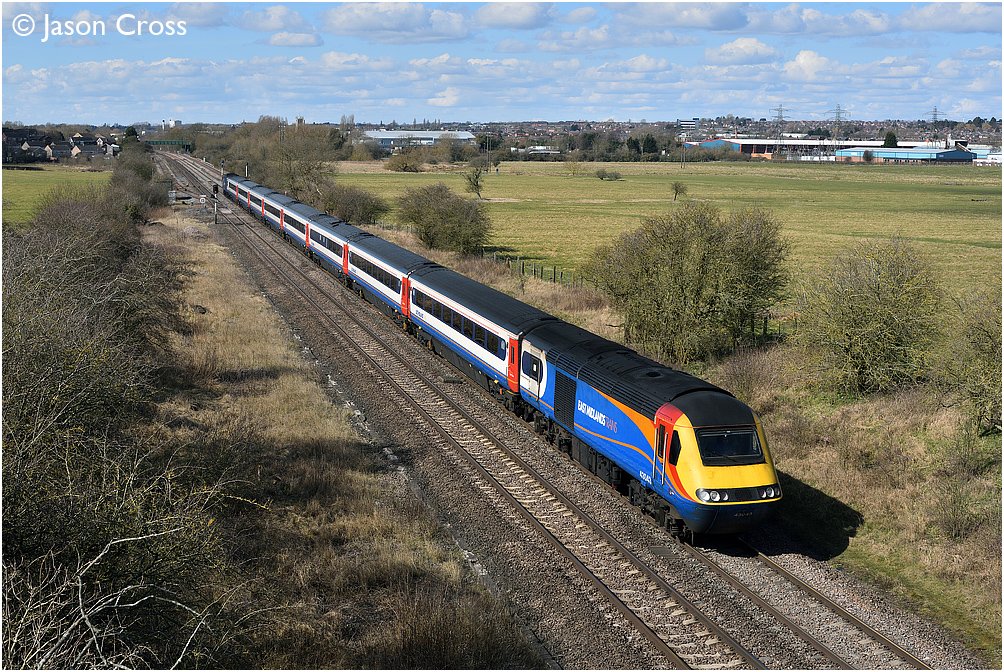 43043 leaves Melton Mowbray with the diverted 1B41 0934 Leeds to St Pancras International. Date: 25 March 2018 Manipulation Notes: None Camera mounted on a tall pole and remotely fired