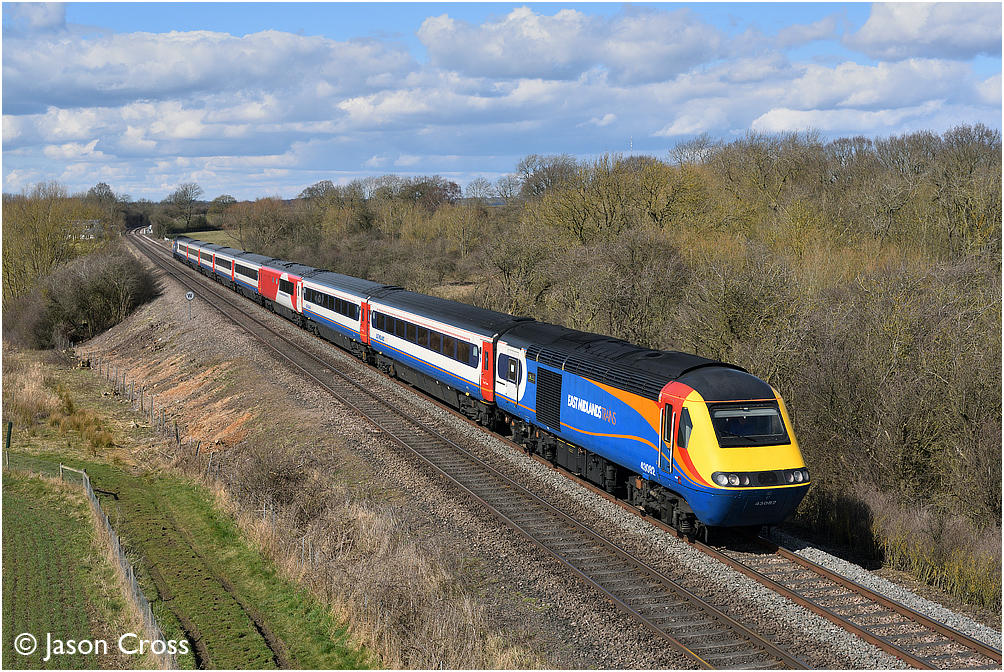 43082 leads the diverted 1B51 1302 Nottingham to St Pancras International towards Whissendine. Date: 25 March 2018 Manipulation Notes: None Camera mounted on a tall pole and remotely fired
