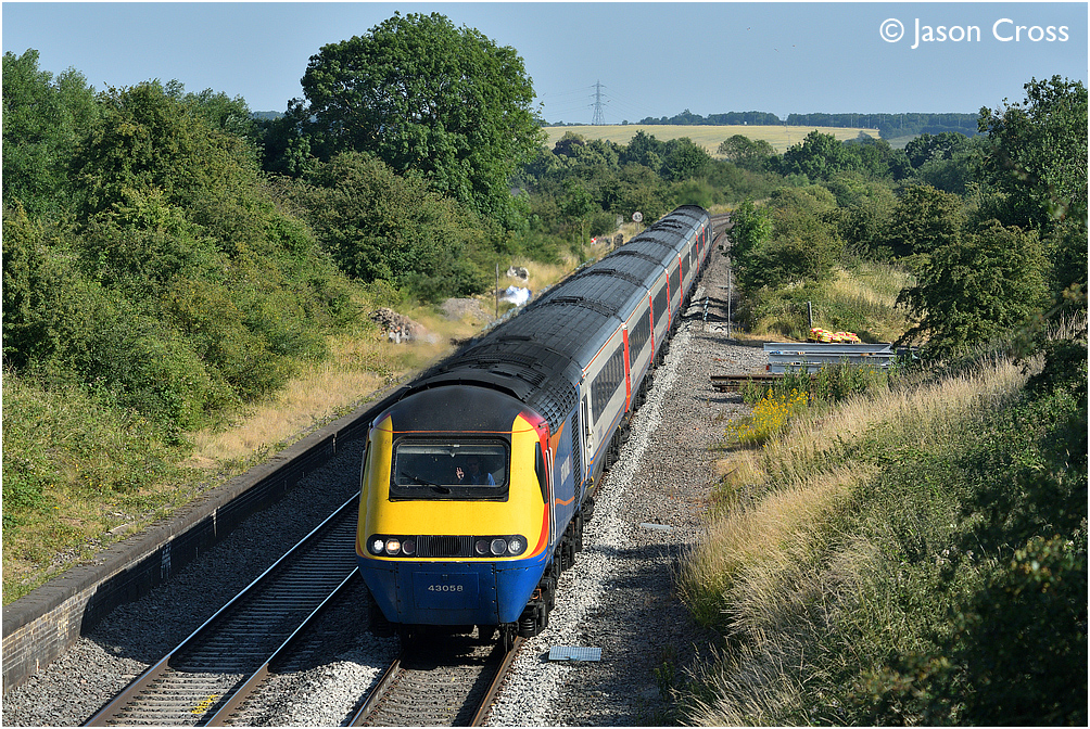 With a cheery wave from the driver, 43058 blasts through the site of the former East Langton station while working 1F55 1647 St Pancras International to Sheffield. Date: 29 June 2018 Manipulation Notes: None