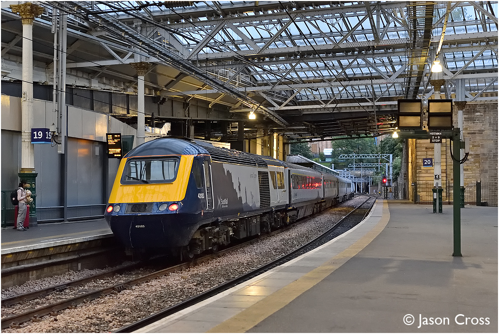 43183 passes through Edinburgh Waverley on the rear of a 5S04 1512 Doncaster Works Wabtec to Haymarket Depot. Date: 17 August 2018 Manipulation Notes: None