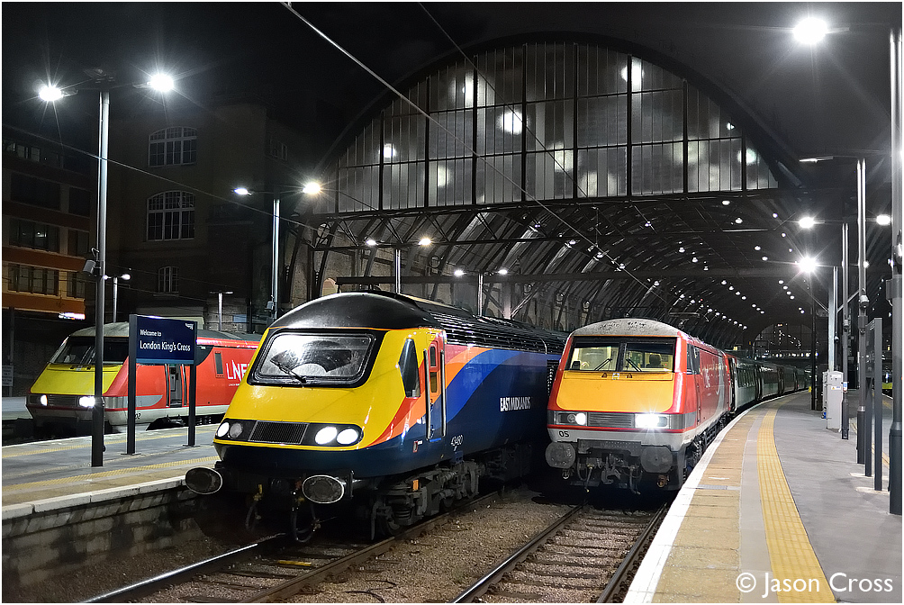 91105 at King's Cross at the head of the 1N35 2200 to York is passed by 43480 as it departs with the 1D34 2135 to Leeds. Date: 23 September 2018 Manipulation Notes: None