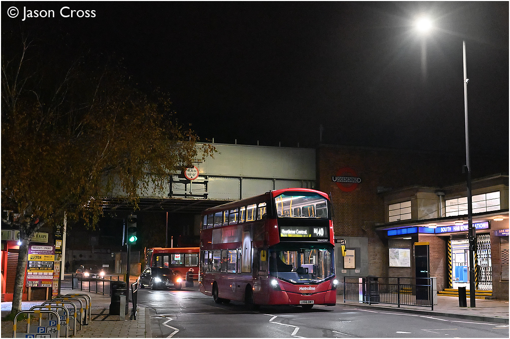 VWH2207 passes by South Harrow station with a N140 service for Heathrow Central. Date: 7 November 2020 Manipulation Notes: None