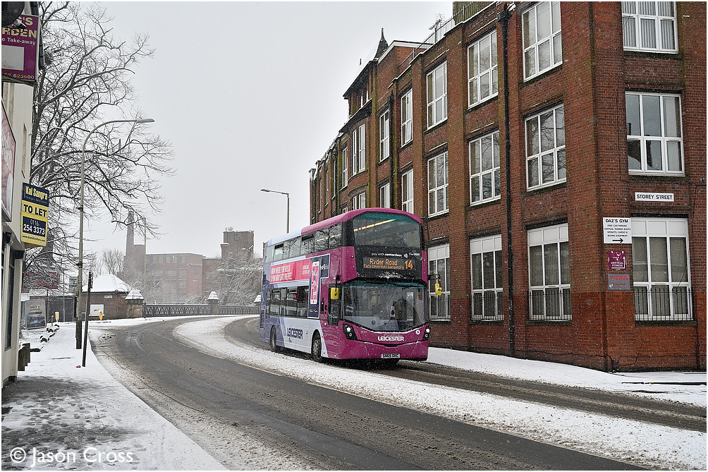 Leicester Buses in the Snow - First Leicester 35151 on Woodgate with a 14 City Centre to Ryder Road service. Date: 24 January 2021 Manipulation Notes: None